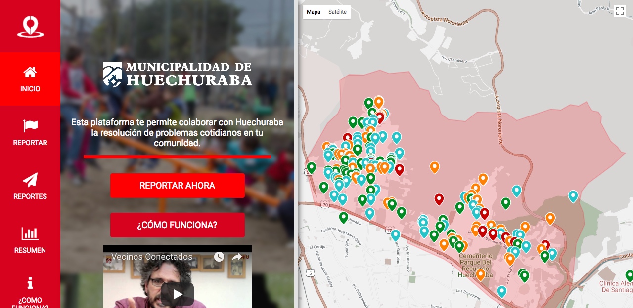 A través de una plataforma digital, #VecinosConectados posibilita que los ciudadanos reporten a sus respectivos municipios asuntos del espacio público y problemas cotidianos. Con un solo clic, los vecinos pueden enviar directamente a sus municipalidades inquietudes, sugerencias y problemas que encuentran en la gestión municipal del espacio público e instaurar un diálogo eficiente y colaborativo entre ambas partes.